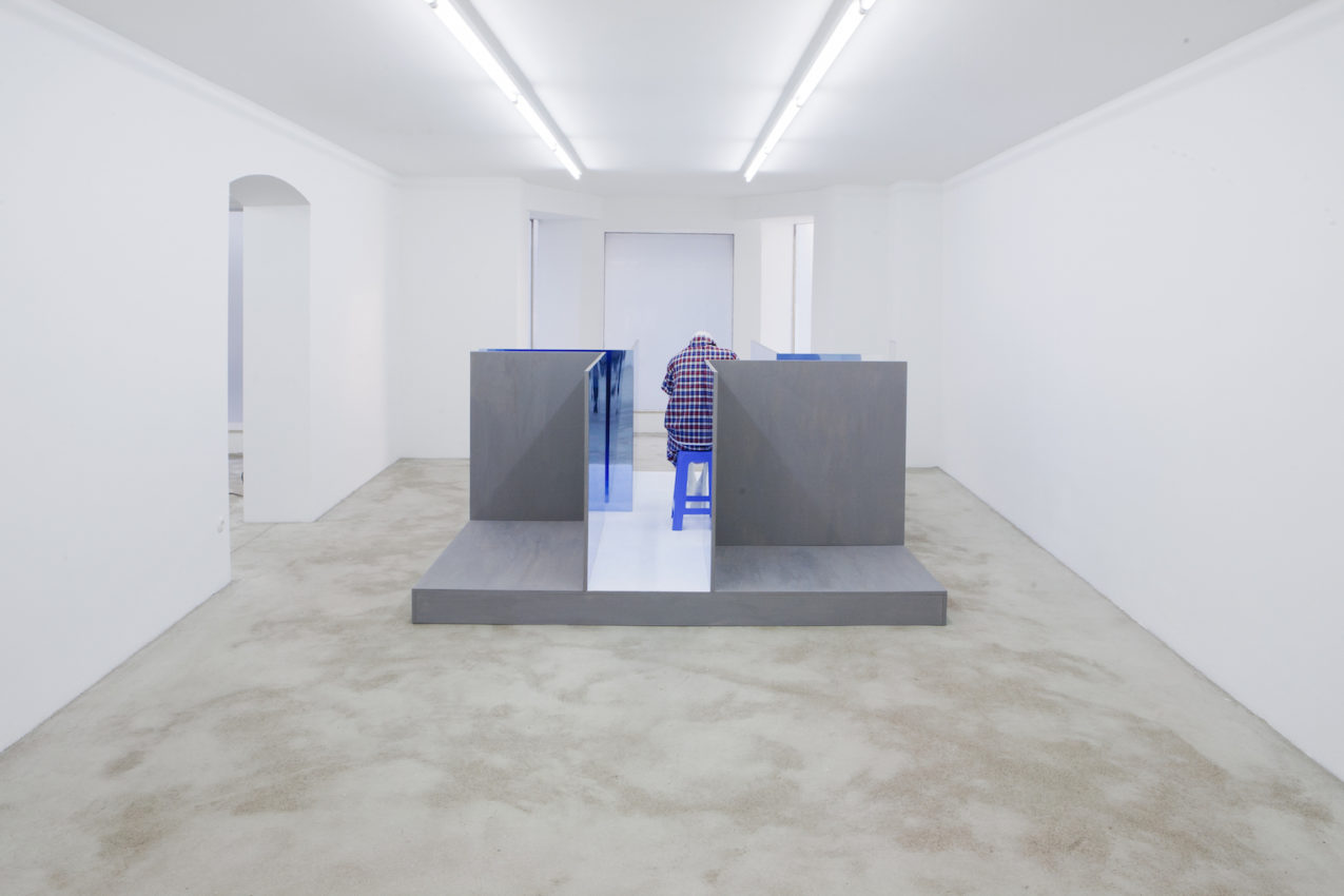 The main thread of the [work] is the idea of migration and the routes and halts until a destination is reached. The main piece is again a sculpture. The fabric the sculpture is dressed in comes from Indonesia and it references the pattern of the so-called refugee bag. There is a closeness and concomitantly a distance between the viewer and the sculpture which is exposed but at the same time sheltered by the walls around it. One can assume that this sensation is similar in the initial relationships immigrants experience in a foreign country.